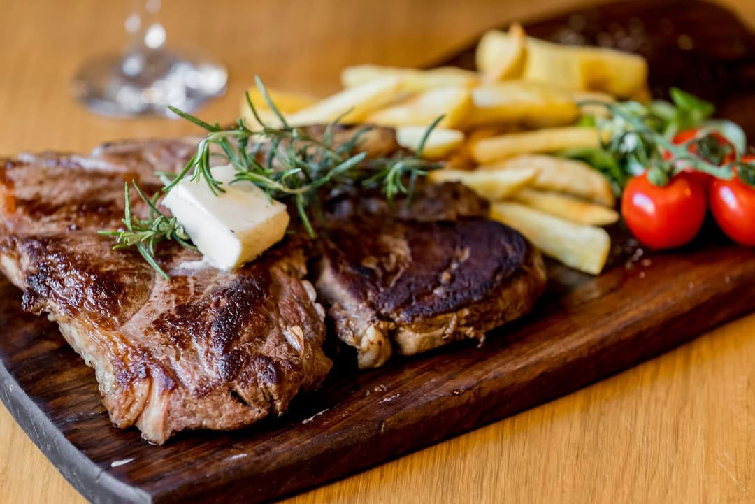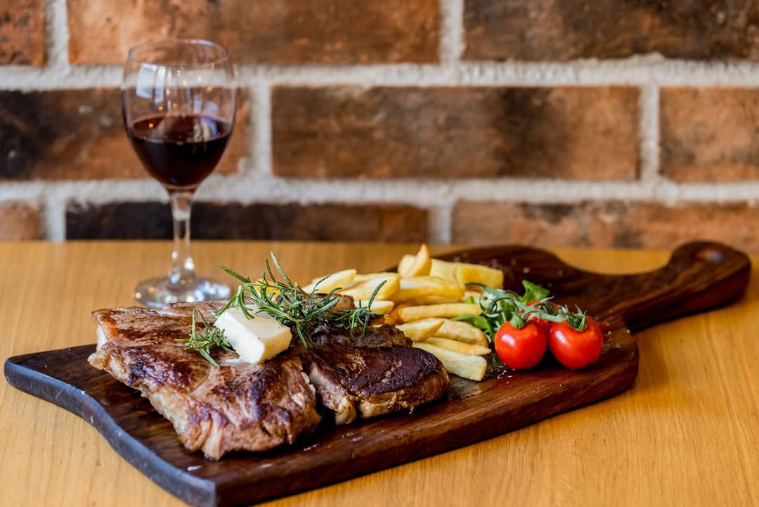 Dobro pečen steak, topli prilozi i čaša vina uz njega.